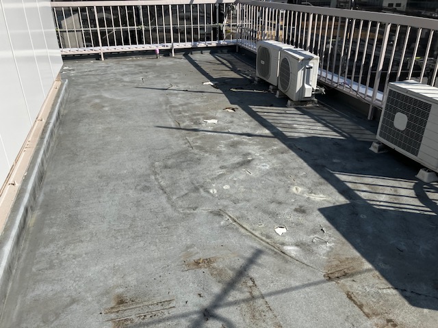 既存ウレタン防水がかなり劣化していたため、不良部はすべて撤去し、ウレタン通気緩衝工法を行いました。